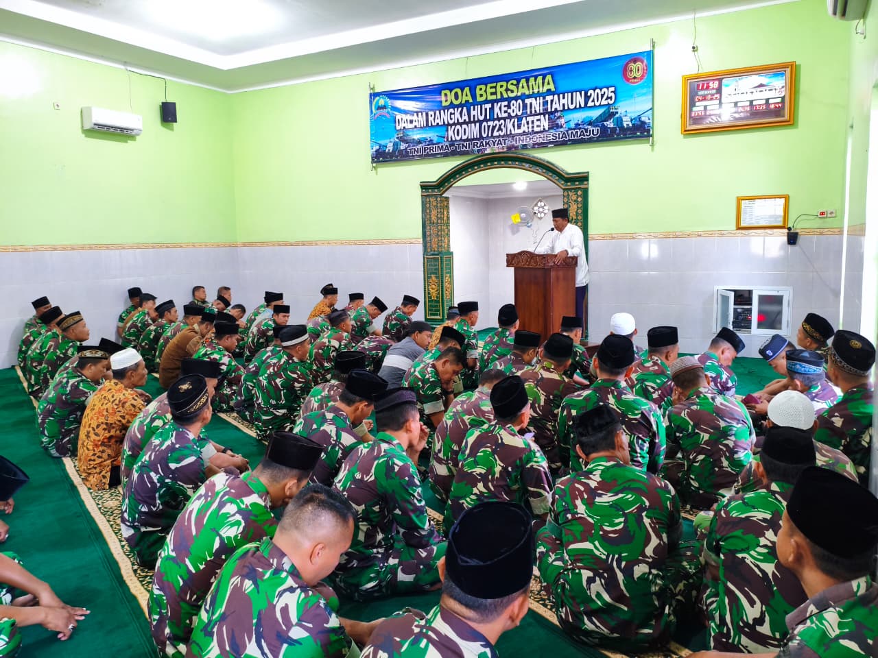 Komandan Kodim 0723/Klaten, Letkol Inf Slamet Hardianto, S.H., M.I.P., dalam keterangannya menyampaikan bahwa kegiatan doa bersama ini merupakan bentuk rasa syukur kepada Tuhan Yang Maha Esa atas bertambahnya usia TNI yang ke-80 tahun, sekaligus wujud harapan agar TNI senantiasa diberi kekuatan, keberkahan serta selalu dekat dengan rakyat dalam menjalankan tugas menjaga kedaulatan bangsa dan keutuhan Negara Kesatuan Republik Indonesia (NKRI).