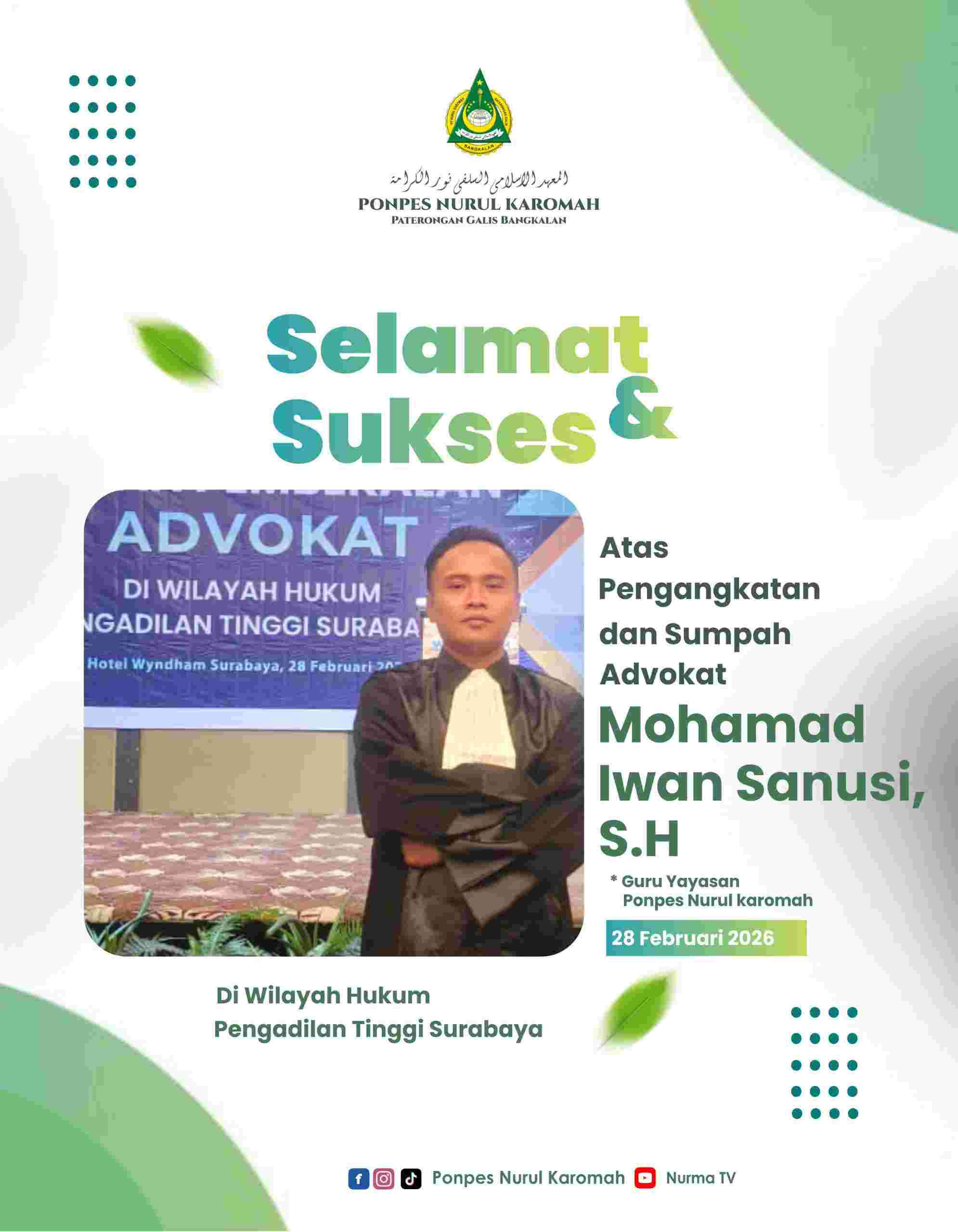 Ponpes Nurul Karomah sendiri menyampaikan ucapan selamat dan sukses yang tulus kepada Mohamad Iwan Sanusi, S.H., melalui poster perayaan yang disebarkan. Dalam poster tersebut, tertulis “Selamat & Sukses Atas Pengangkatan dan Sumpah Advokat Mohamad Iwan Sanusi, S.H.” yang disertai dengan foto momen pelantikannya.