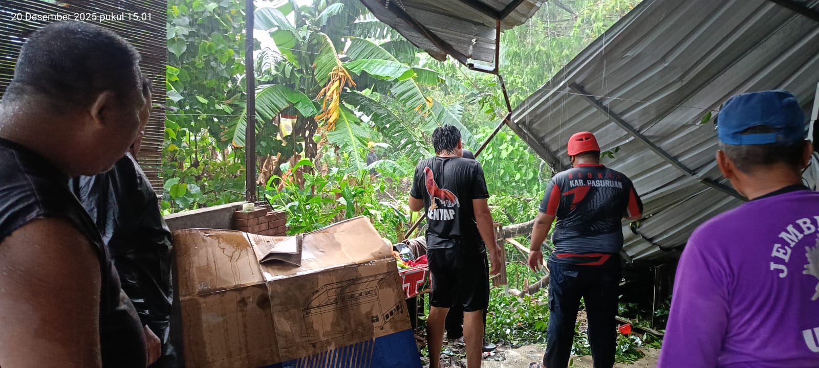 Pasuruan, REALITA – Hujan deras disertai angin kencang melanda wilayah Kecamatan Gempol, Kabupaten Pasuruan, Sabtu (20/12/2025) siang menyebabkan sejumlah rumah warga rusak parah usai di timpa pohon tumbang