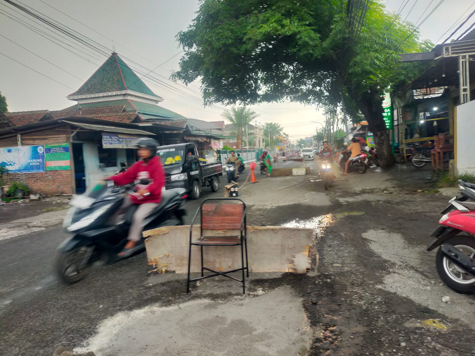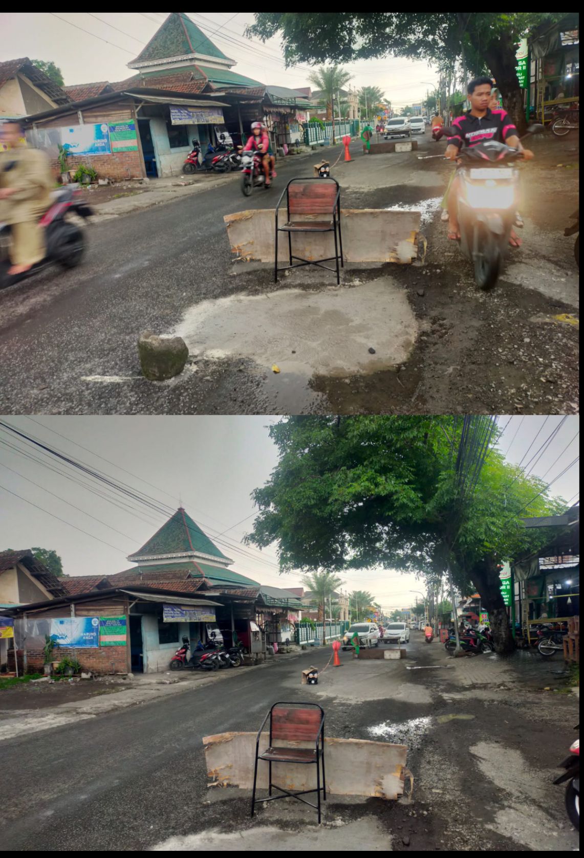 “Banyak warga yang melintas jatuh dan mengalami luka ringan karena rodanya terperosok di kubangan jalan”jelasnya Syaipul.