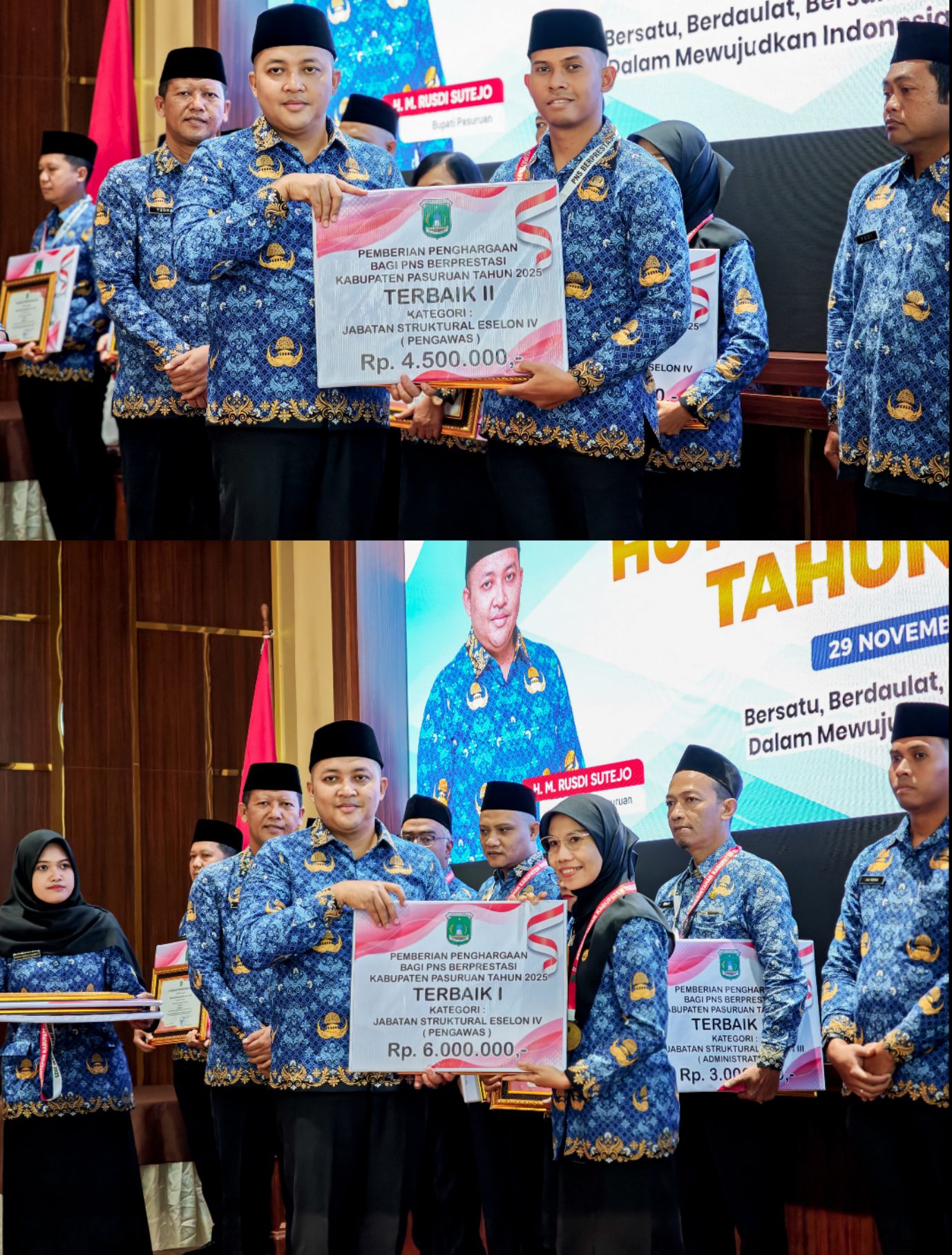 Pasuruan, REALITA  – Bupati Pasuruan Rusdi Sutejo mengajar 15 ASN yang bertugas di lingkungan di Organisasi Perangkat Daerah (OPD) berbeda berupa reward dan penghargaan atas prestasi kinerja , penyerahan di berikan secara simbolis usai apel peringatan Hari Ulang Tahun (HUT) Korps Pegawai Republik Indonesia (KORPRI) ke-54 di gedung Putih pada Senin ( 01/12/2025).