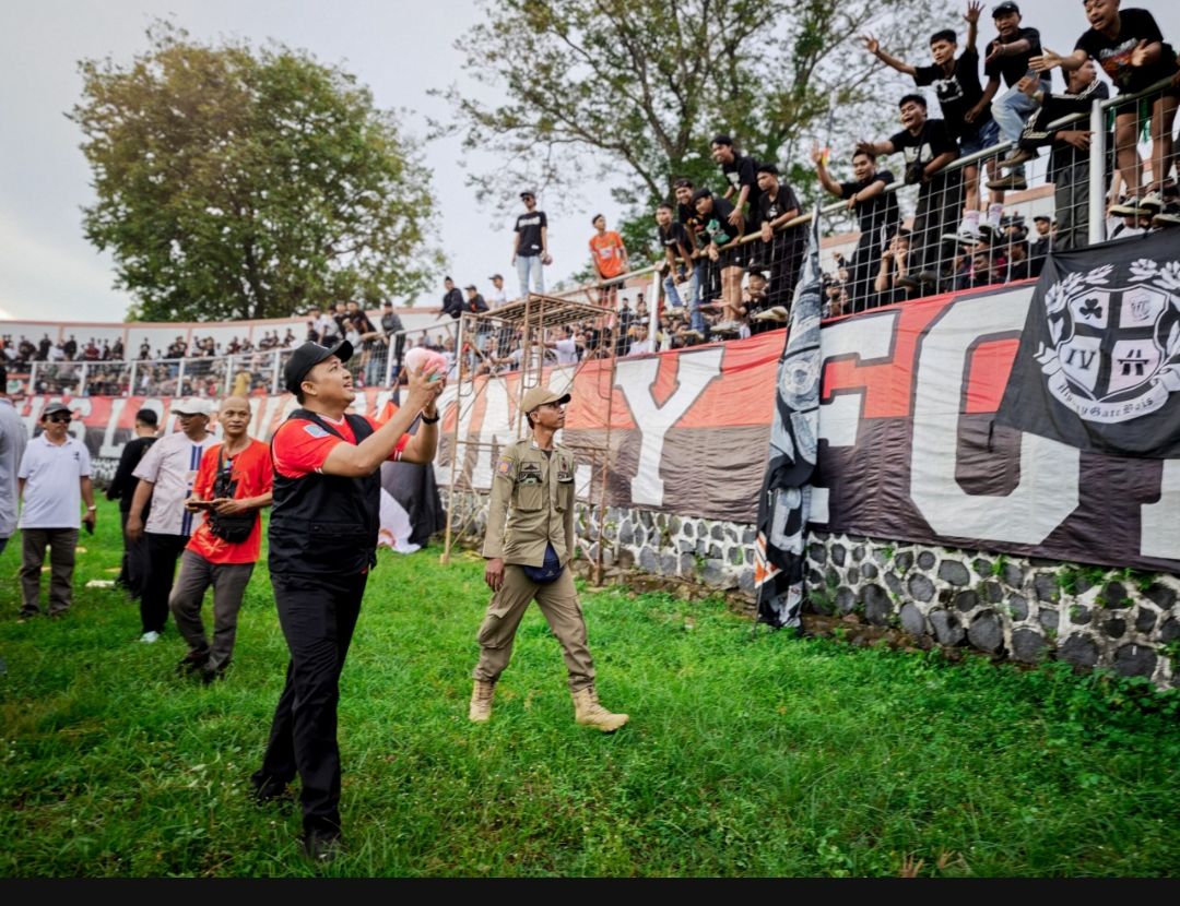 Untuk memberikan semangat kepada para suporter dukungan kepada tim kebanggaan mereka saat bertanding,Mas Rusdi berkeliling stadiun R-Soedarsono untuk membagikan jersy kebanggan tim Persekabpas sambil menyapi para penonton.(abi/sul)