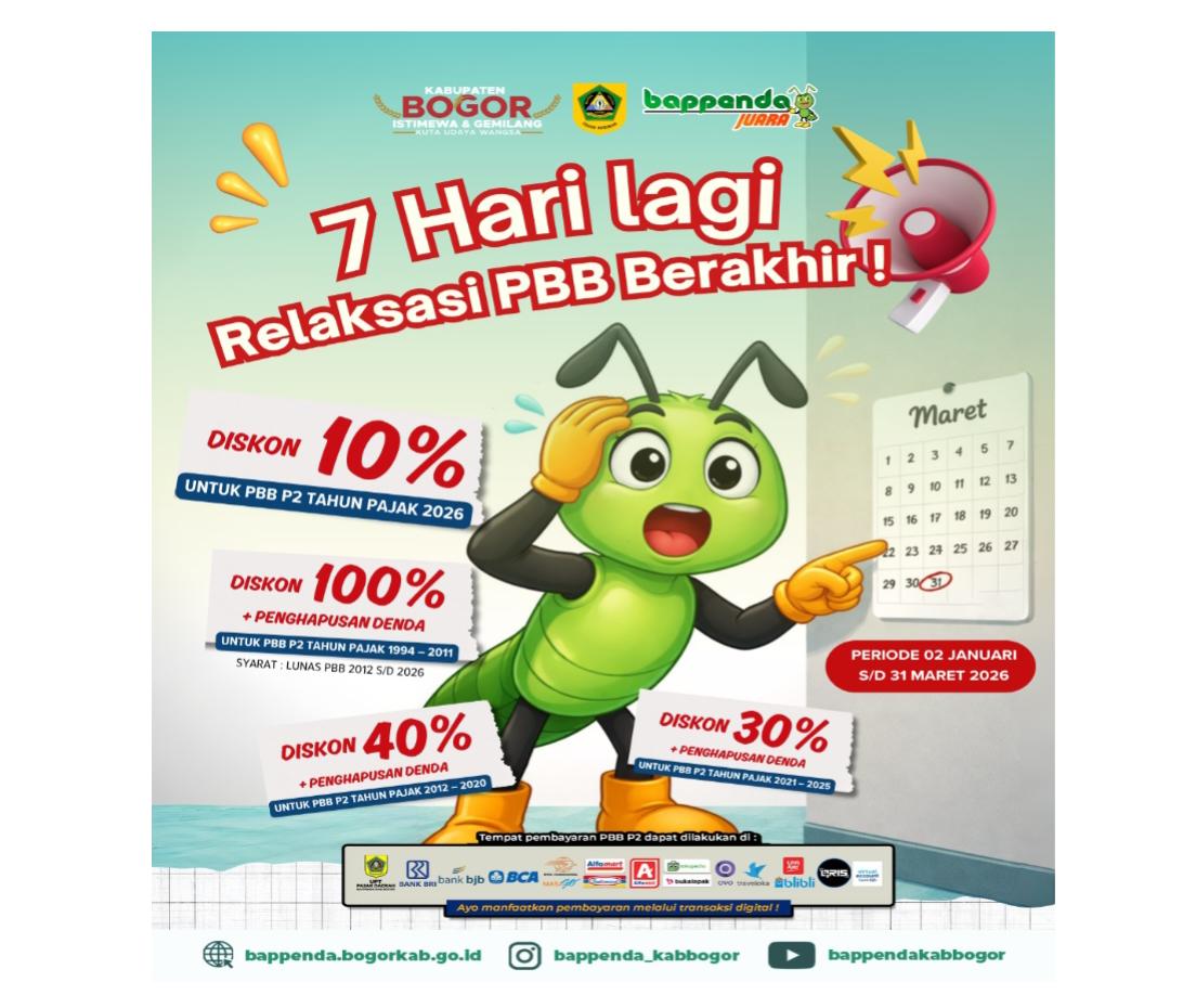 CIBINONG – Pemerintah Kabupaten (Pemkab) Bogor melalui Badan Pengelolaan Pendapatan Daerah (Bappenda) Kabupaten Bogor terus menghadirkan berbagai kemudahan layanan serta program insentif guna mendorong kesadaran masyarakat dalam memenuhi kewajiban perpajakan. Program Insentif tersebut berlaku hingga tanggal 31 Maret 2026.