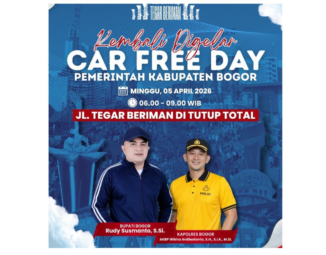 CIBINONG, REALITA– Pemerintah Kabupaten (Pemkab) Bogor akan menggelar kembali kegiatan Car Free Day (CFD) di kawasan Jalan Tegar Beriman, Cibinong, pada Minggu, 5 April 2026. Kegiatan yang berlangsung mulai pukul 06.00 WIB hingga 09.00 WIB tersebut akan disertai penutupan total ruas jalan untuk mendukung kelancaran acara yang dipusatkan di sepanjang Jalan Tegar Beriman.