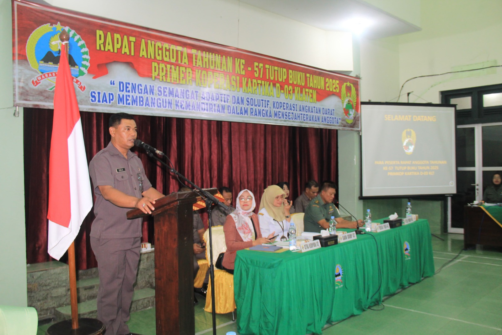 “Rapat Anggota Tahunan ini bukan sekadar agenda rutin, tetapi merupakan bentuk pertanggungjawaban pengurus kepada anggota sekaligus momentum evaluasi dan perbaikan berkelanjutan. Saya berharap Primkop Kartika D-03 Klaten terus adaptif menghadapi dinamika ekonomi serta mampu menghadirkan solusi nyata bagi kesejahteraan seluruh anggotanya,” ungkap Mayor Inf Ismail Syafrudin.