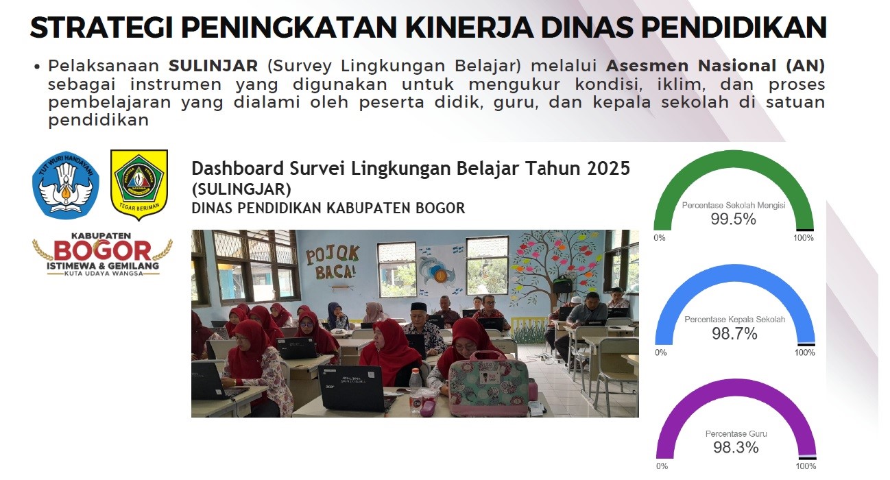 Sebagai perpanjangan tangan Bupati Bogor melalui Peraturan Bupati Bogor Nomor 129 Tahun 2021 tentang Kedudukan, Susunan Organisasi, Tugas dan Fungsi Serta Tata Kerja Dinas Pendidikan. Bersama ini disampaikan capaian kinerja dan perencanaan Dinas Pendidikan Kabupaten Bogor Tahun Anggaran 2025.