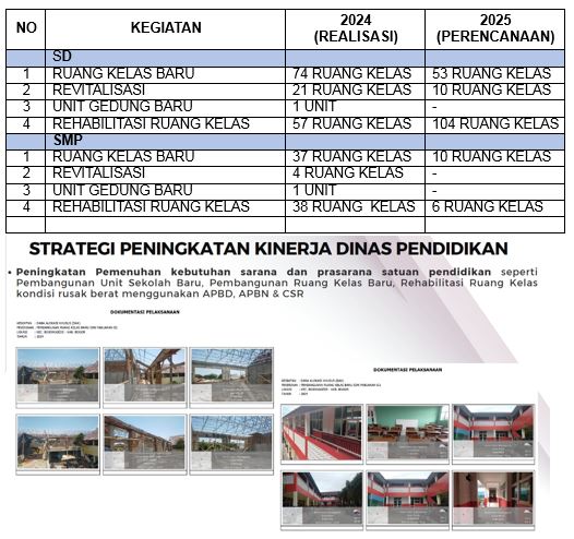 Dalam pemenuhan dan pengembangan sarana dan prasarana fisik penunjang mutu kualitas pembelajaran, Dinas Pendidikan Kabupaten Bogor telah melakukan serangkaian pembangunan dan penanganan kondisi fisik bangunan pada satuan pendidikan yang tersebar di 40 Kecamatan se-Kabupaten Bogor dengan data sebagai berikut :