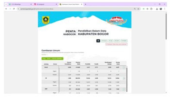 - selaku pemangku kebijakan layanan pendidikan sesuai dengan Peraturan Bupati Nomor 129 Tahun 2021 Tentang Kedudukan, Susunan Organisasi, Tugas dan Fungsi Serta Tata Kerja Dinas Pendidikan. Dengan dasar tersebut Dinas Pendidikan Kabupaten Bogor meluncurkan program pengembangan sistem Pendidikan Dalam Data (PENTA) dengan harapan tercapainya pemetaan dan pemerataan penyebaran tenaga pendidik dan kependidikan di seluruh satuan pendidikan dengan tujuan pemaksimalan layanan pendidikan bagi masyarakat Kabupaten Bogor.