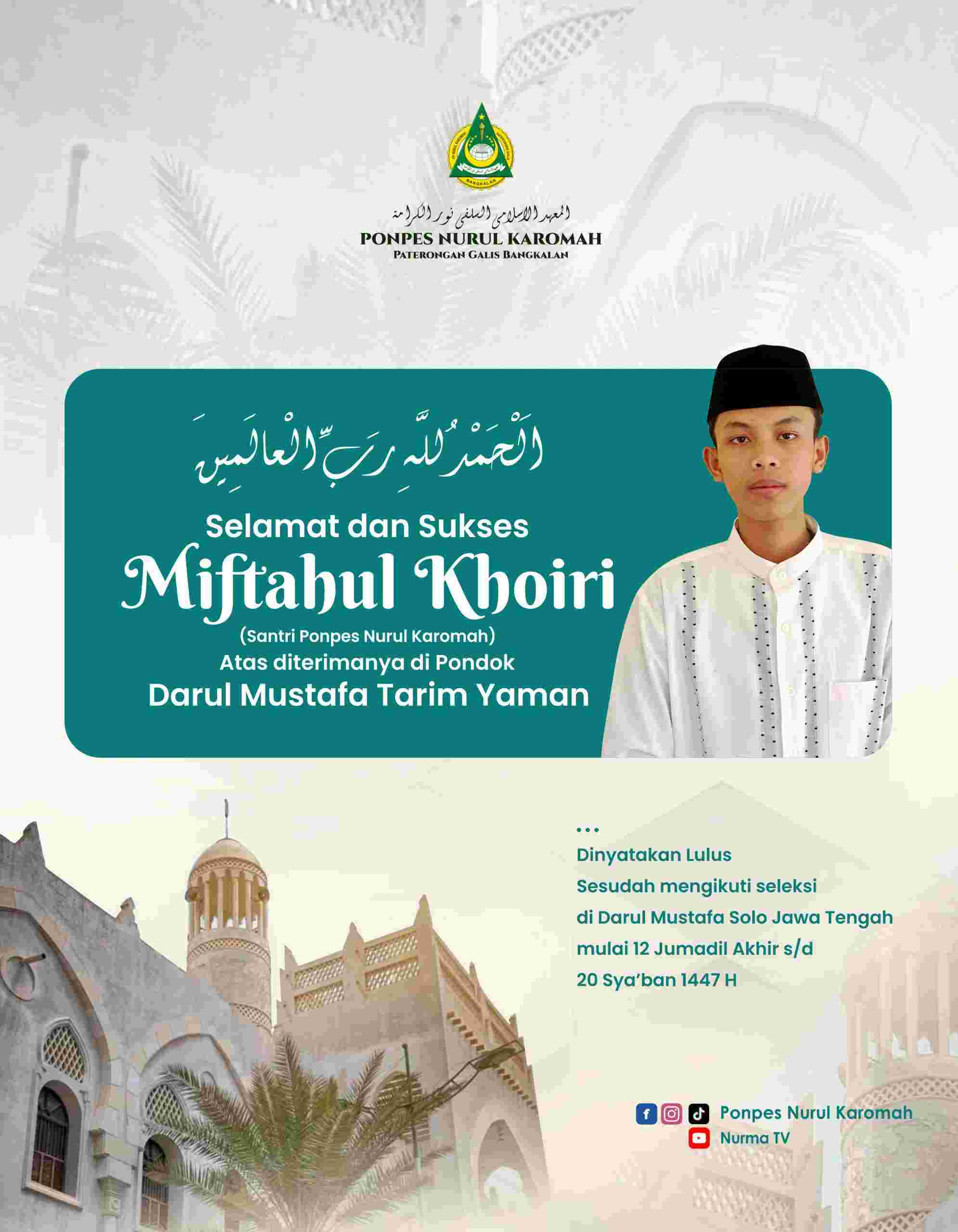 Proses seleksi yang diikuti Miftahul tidaklah mudah. Ia harus bersaing dengan ribuan calon santri dari berbagai daerah saat mengikuti tes di pusat seleksi Darul Mustafa Solo, Jawa Tengah, yang berlangsung selama hampir dua minggu, mulai 12 Jumadil Akhir hingga 20 Sya’ban 1447 H. Dengan tekad yang bulat dan bekal ilmu yang diperoleh dari Ponpes Nurul Karomah, ia berhasil menunjukkan kemampuannya dan dinyatakan lulus.