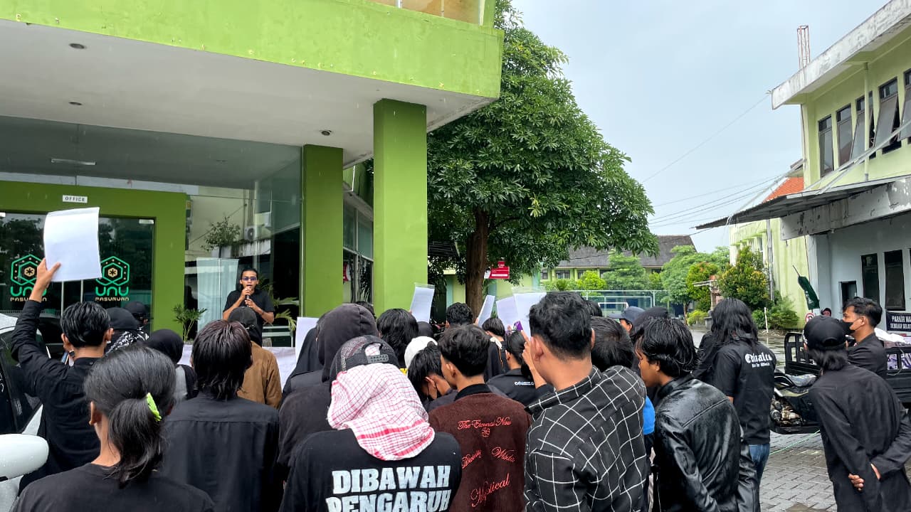 Massa yang tergabung dalam Aliansi Mahasiswa UNU Pasuruan menggelar aksi demonstrasi untuk menuntut kejelasan terkait mandeknya regenerasi organisasi serta belum terealisasinya hak identitas mahasiswa berupa jas almamater dan Kartu Tanda Mahasiswa (KTM).